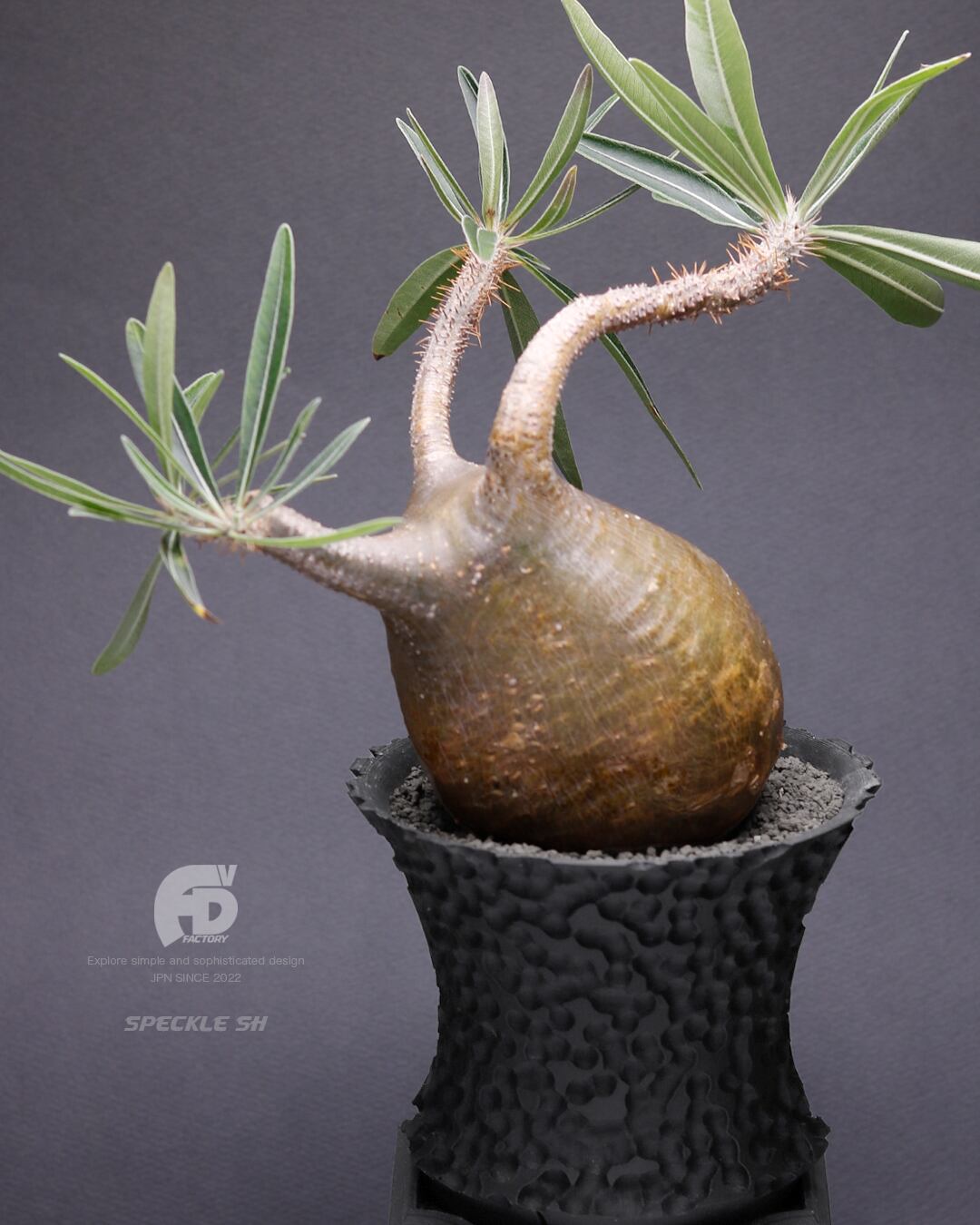異なる質感を大胆に組み合わせた「Speckle × Helix SH 2FACE」は、荒々しい表情のあるSpeckle(点状テクスチャー)ともう一方は動きを感じるHelix(螺旋状テクスチャー)の融合により、見る角度で印象が変化する「静 / 動」のアート性の高い3Dプリント鉢